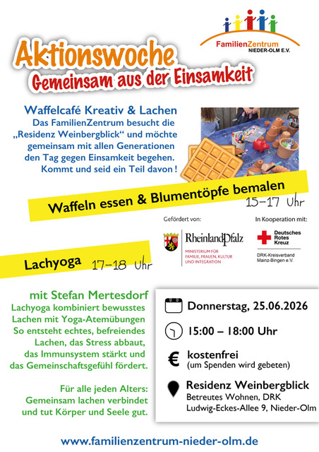 Auch in diesem Jahr beteiligt sich das FamilienZentrum Nieder-Olm mit einem Aktionstag Waffelcafe kreativ und lachen an der Aktionswoche „Gemeinsam aus der Einsamkeit“.